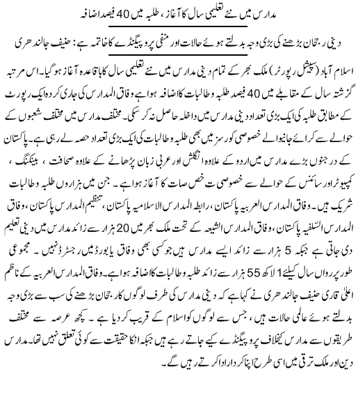Madrassas are basically schools, and with the right curriculum and progressive teachers, it could be a great source of education for poorer classes. This is where the government could come in and facilitate access for Madrassa's to a better curriculum, one that concentrates on the positive aspects of education and our religion itself.